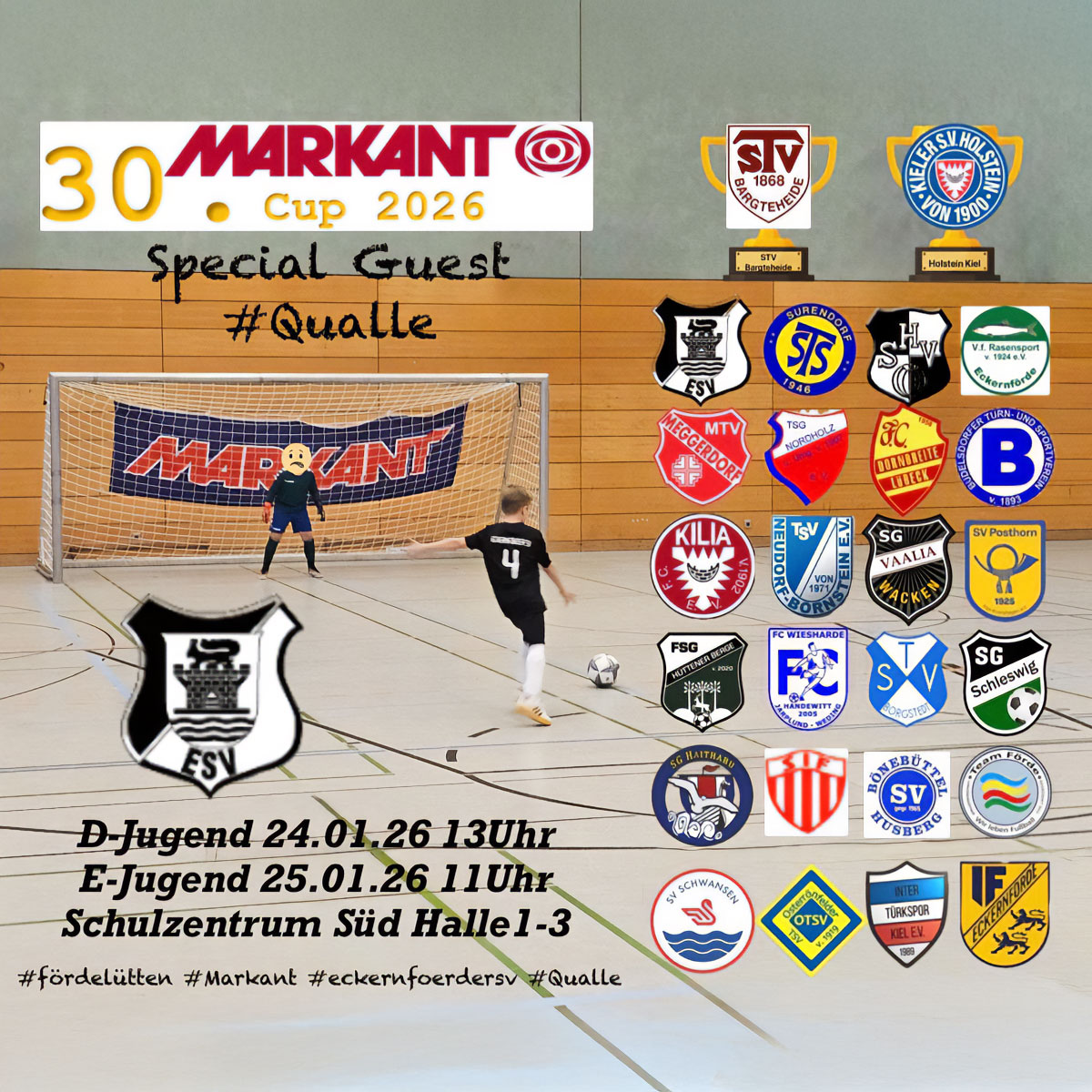 Eines der größten Jugendturniere in Schleswig-Holstein feiert 30-jähriges Jubiläum. Wenn der MARKANT-CUP am Sonnabend, 24. Januar und Sonntag, 25. Januar 2026, seine Tore öffnet, rollt der Ball zum 30. Mal und hat mittlerweile Generationen von Jugendfußballern begrüßen dürfen und so findet man in den Siegerlisten, viel norddeutsche Fußball-Prominenz, wie beispielsweise den HSV, FC St. Pauli oder den Störche Nachwuchs aber auch Vertreter aus unserem nördlichen Nachbarland Dänemark, wie SUB Sonderburg, haben sich in den Siegerlisten verewigt.